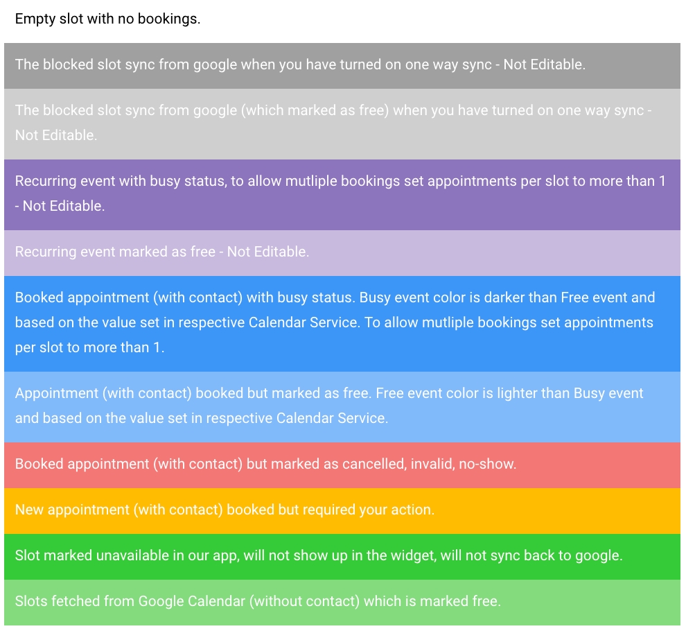 The calendar in our software color codes your appointments and time slots. You may wonder what the different colors mean. Refer to the legend below for an understanding of each: