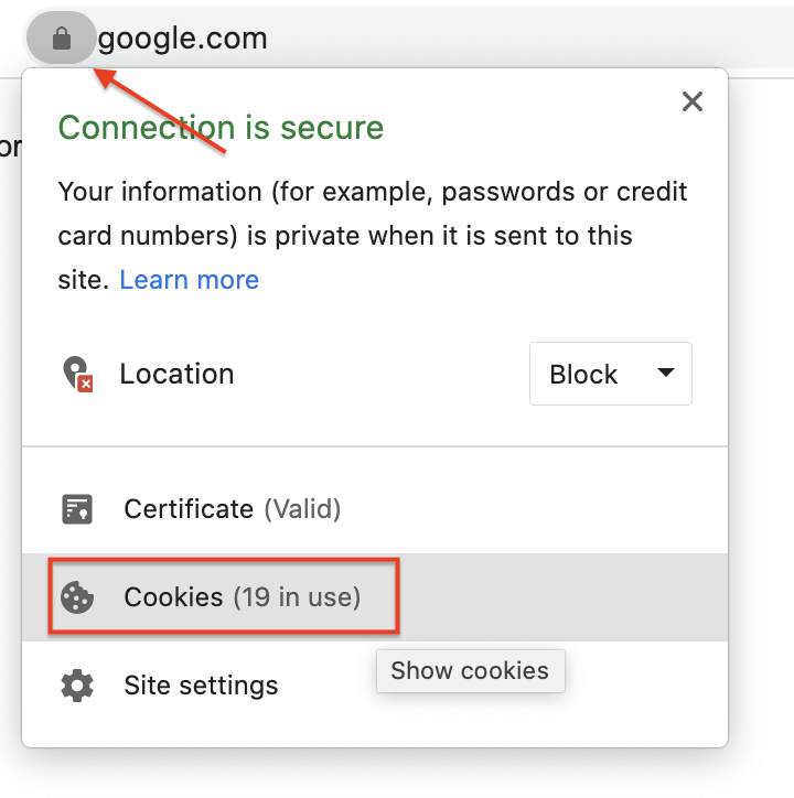 Click the lock icon next to the url of the page (in this example we use google.com but you'll want to use the actual page that isn't loading)
