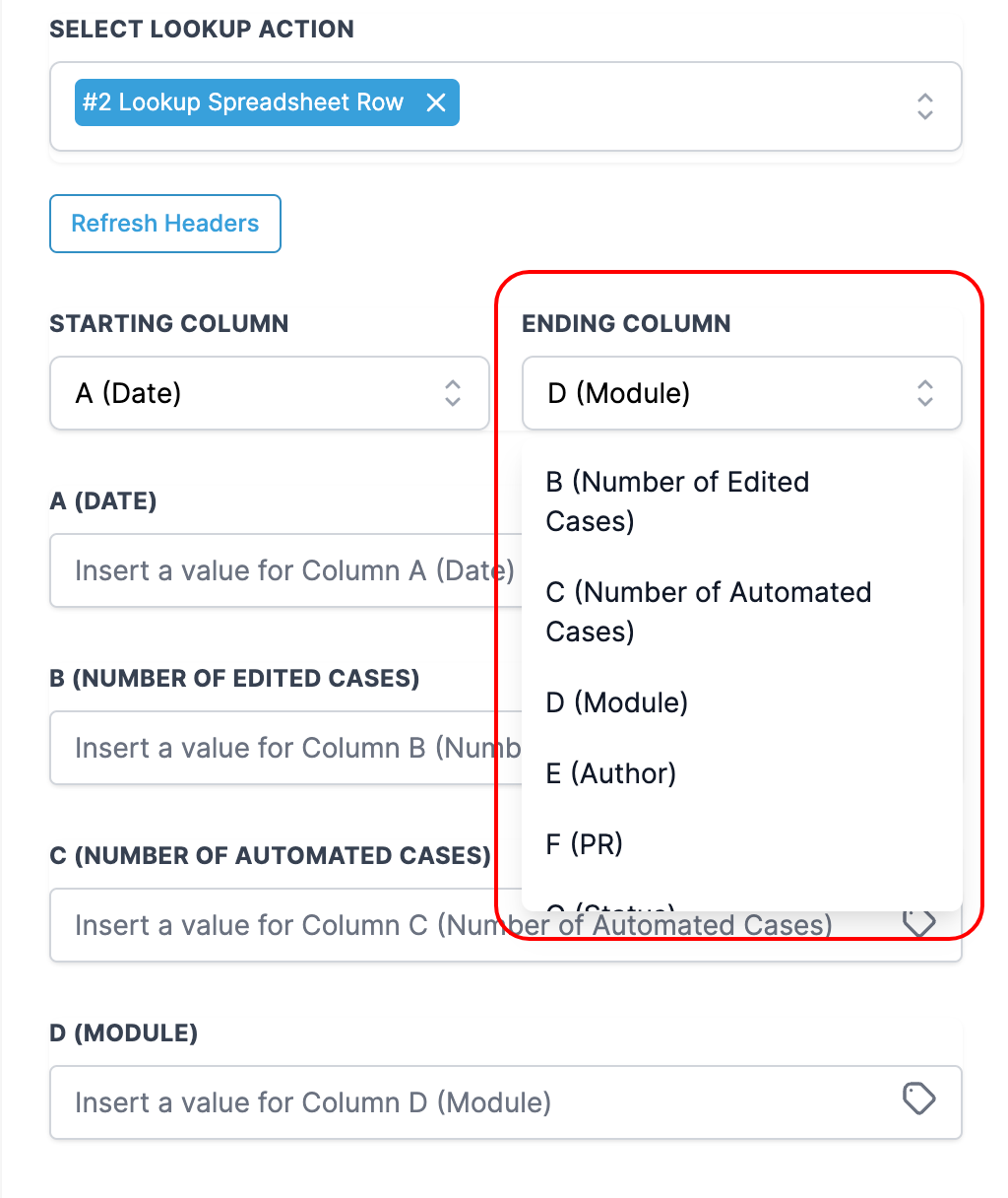 To update the desired columns, select the starting and ending columns.
