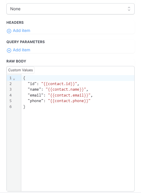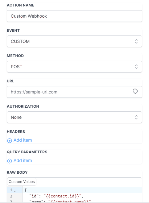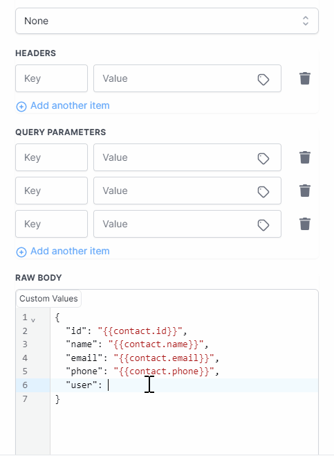 Custom Webhook premium feature allows you to map custom values in any structure that suits your requirements. We have a user-friendly textbox that provides autocomplete suggestions for all custom values, including inbound webhook variables.