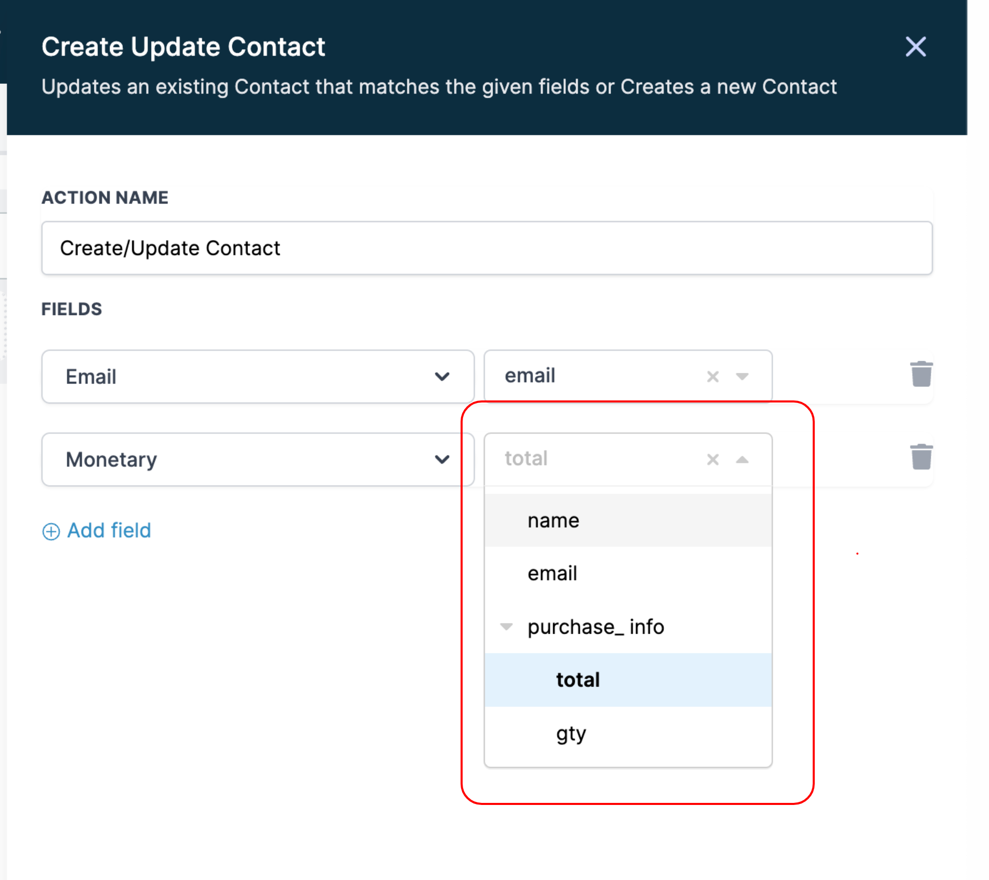 Upon saving the trigger, you will be directed to the “Create Update Contact” action. From there, you can select the necessary fields and map the incoming data that you have received from the trigger. Please note that to create a new contact or map data to an existing one, you must provide either an email or phone field.